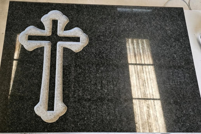 Lápida granito negro Sudáfrica, 2 cm, cruz sencilla con fondo repicado o pintado en plata, inscripción arenada pintada en plata, foto 10x8 color incluida, juego de garras incluido